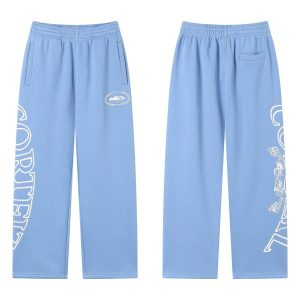 Corteiz Beige Hoodie Set made of heavyweight cotton, soft and thick. Features black graffiti logo on back and leg, loose fit, ribbed trims, kangaroo pocket. Unisex streetwear style for daily comfort.