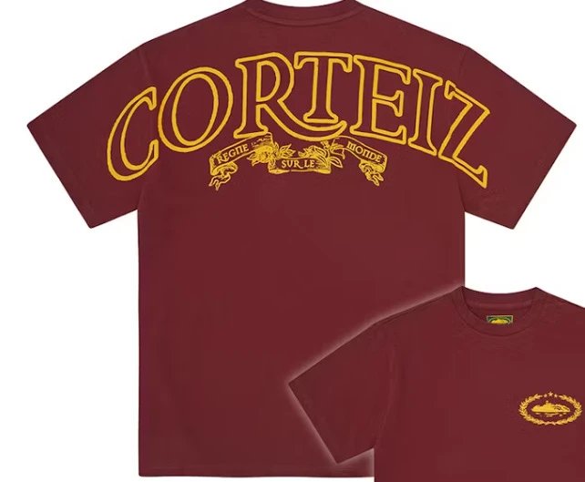 Corteiz Burgundy Heavyweight Cotton T-Shirt with gold vintage crest and bold logo, unisex streetwear style, breathable comfort, showcasing classic British retro street fashion.