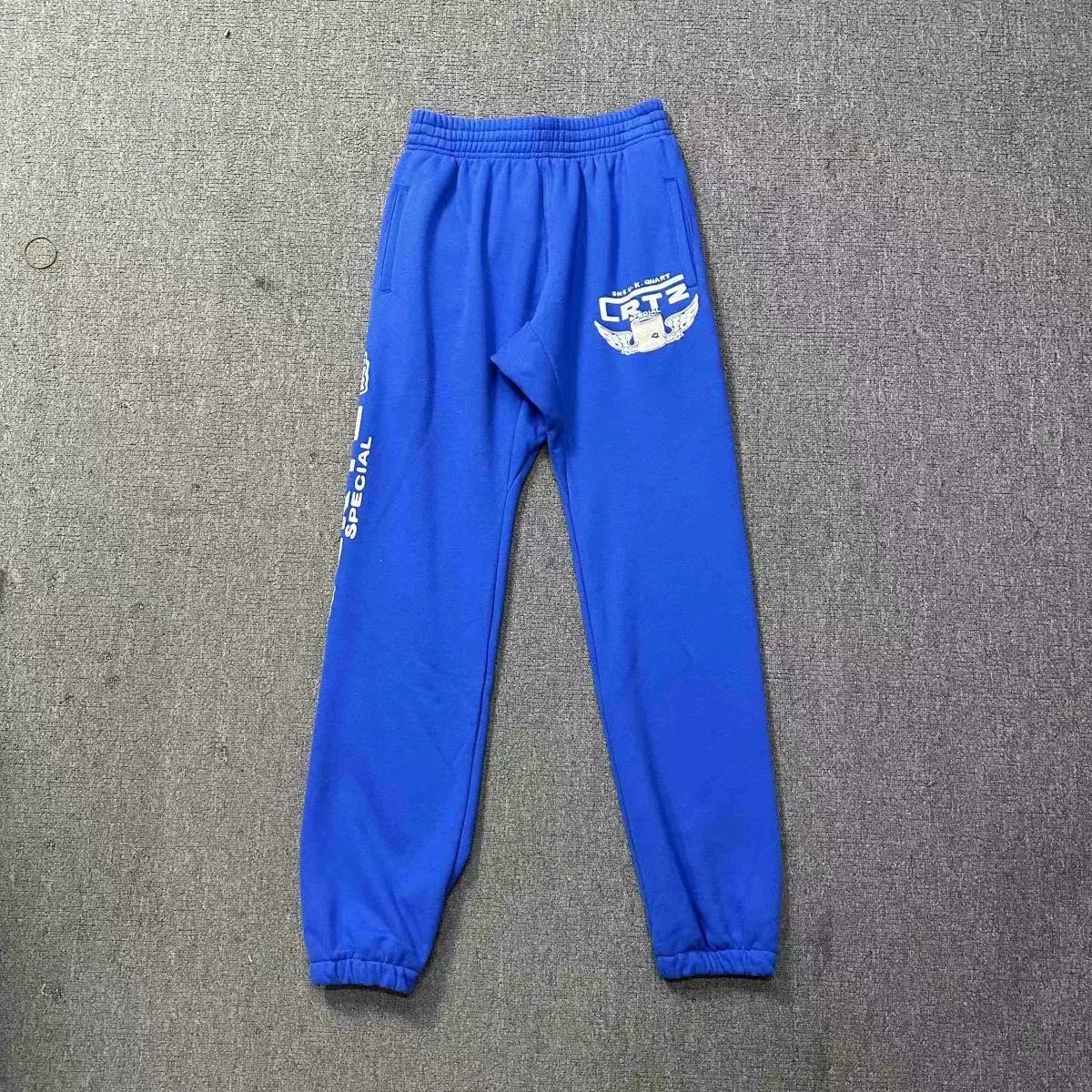 Corteiz Blue CRTZ Special Sweatpants, crafted from soft cotton with logo and wing print on leg, elastic waist and cuffs for comfort and street style, unisex design with British urban flair.