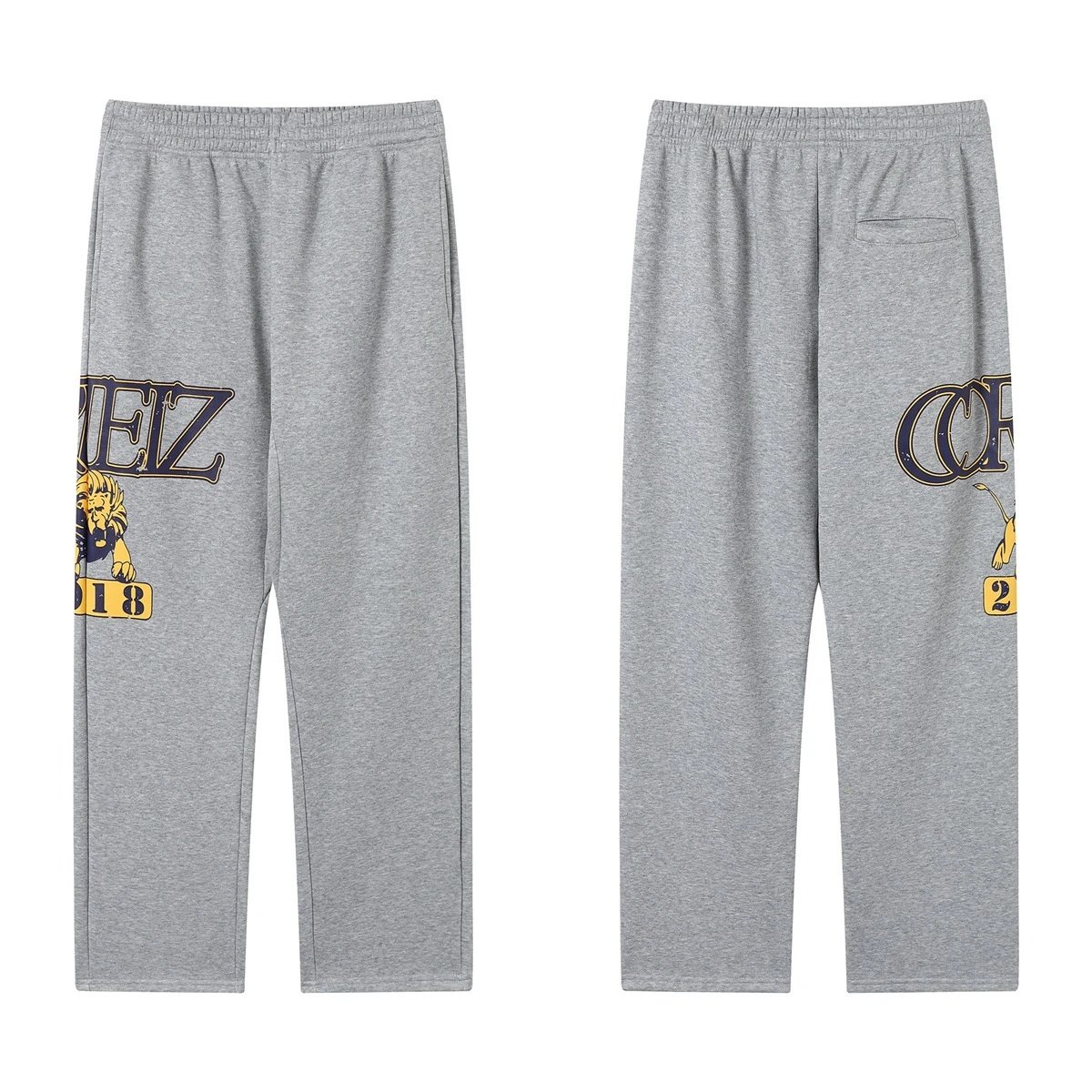 Corteiz Grey Sweatpants crafted from soft cotton for all-day comfort, featuring bold lion logo and year graphic on leg, unisex loose fit for a vintage streetwear athletic look.