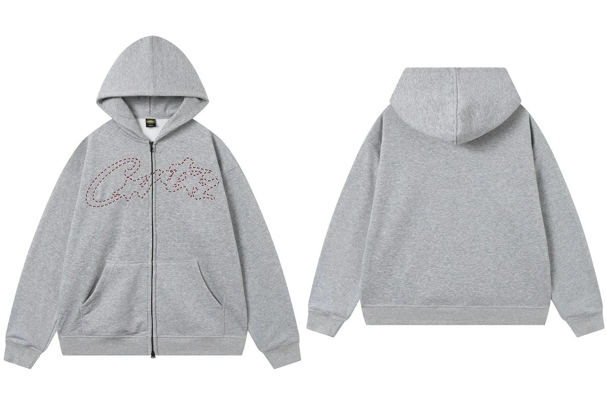 Corteiz Grey Zip Hoodie – crafted from soft cotton, featuring a 3D embroidered logo on chest, minimalist loose fit, unisex streetwear design blending urban style with ultimate comfort.