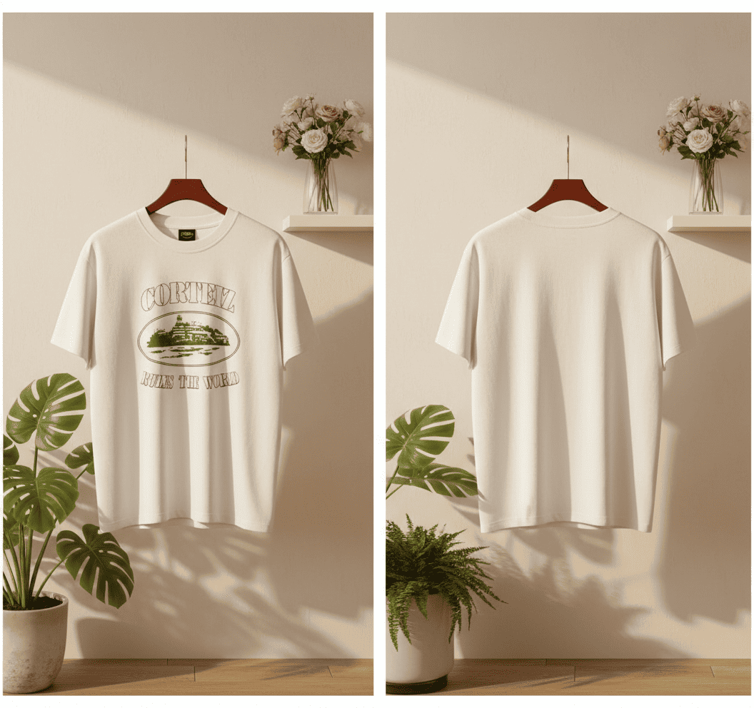 Corteiz White Street Style Cotton T-Shirt with Green Vintage Graphic, Unisex Loose Fit, Soft and Breathable Fabric for Urban Casual Fashion.