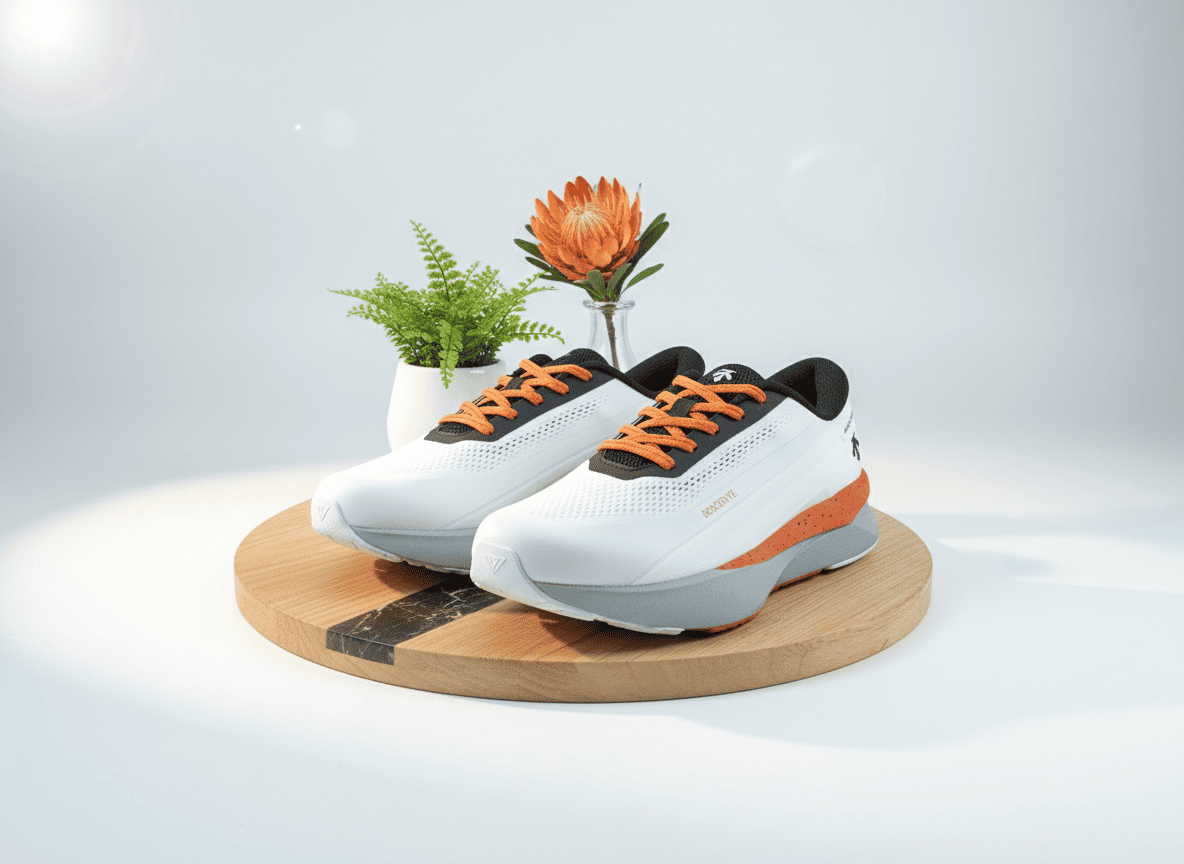 DESCENTE Dynamic Fluid running shoes feature a white-orange color mix, breathable mesh upper, cushioned midsole, and splash detail for a sporty tech look. Unisex design for city runs and daily wear.