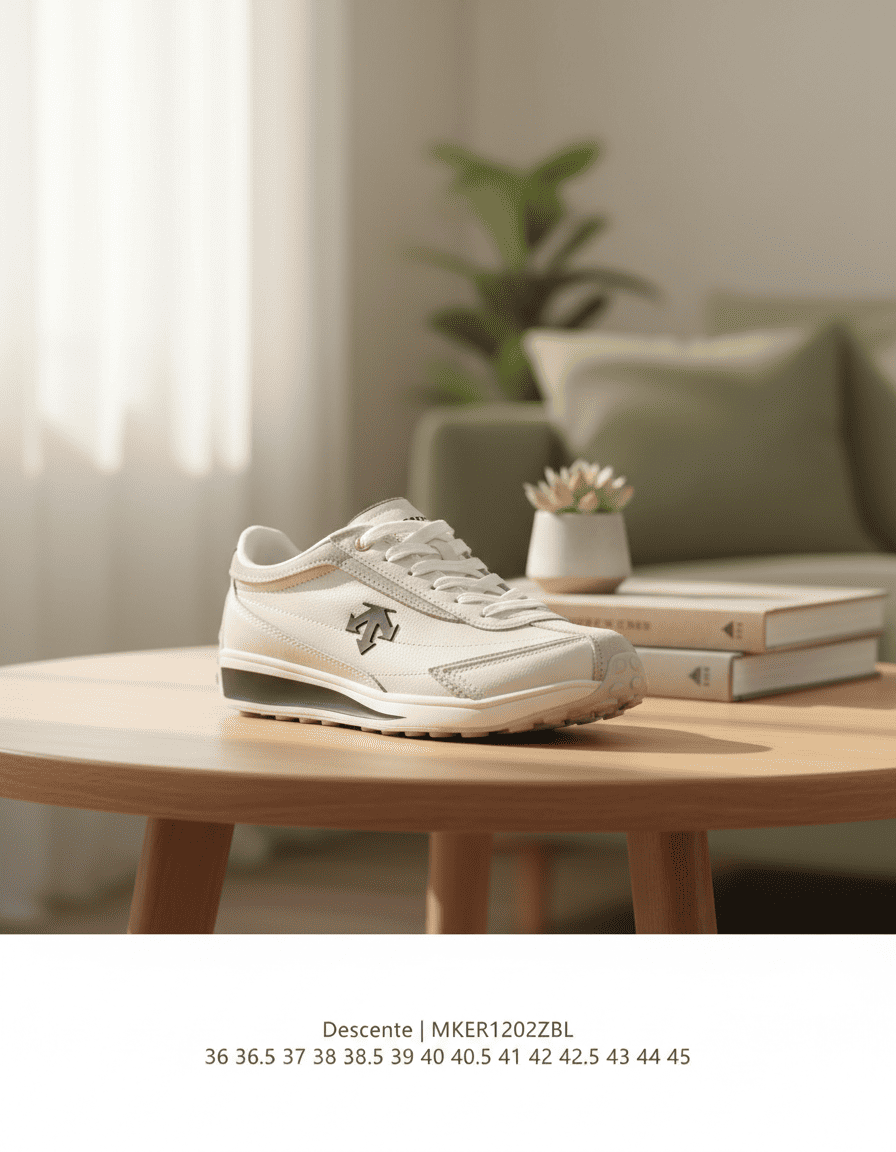 Descente off-white retro running shoes with premium leather and mesh upper, breathable and durable, bold black arrow logo, cushioned midsole for comfort, unisex design for urban sporty style.