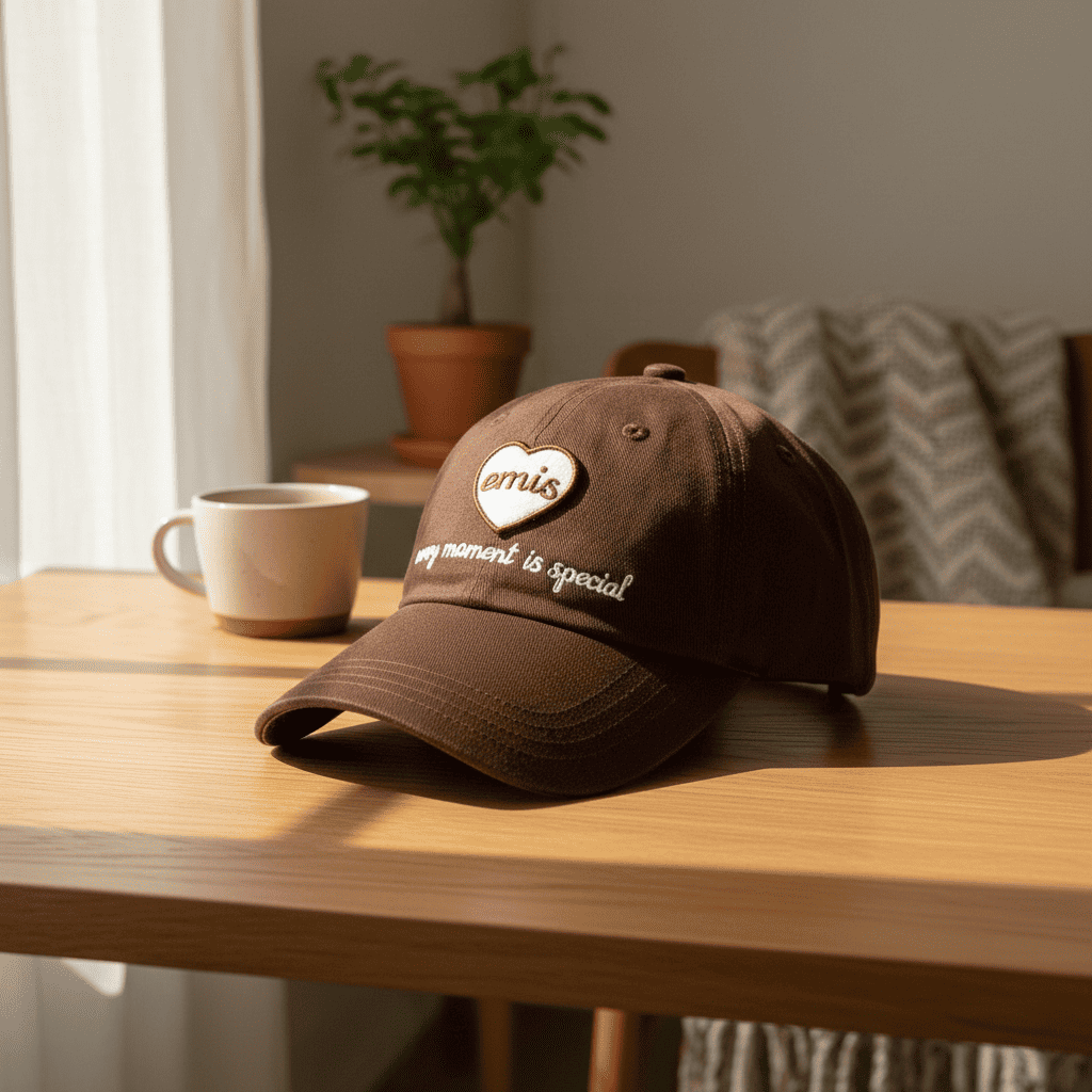 Emis Brown Cotton Baseball Cap with heart embroidery and English logo, soft breathable fabric, unisex casual Korean retro style, perfect for all seasons and everyday streetwear.