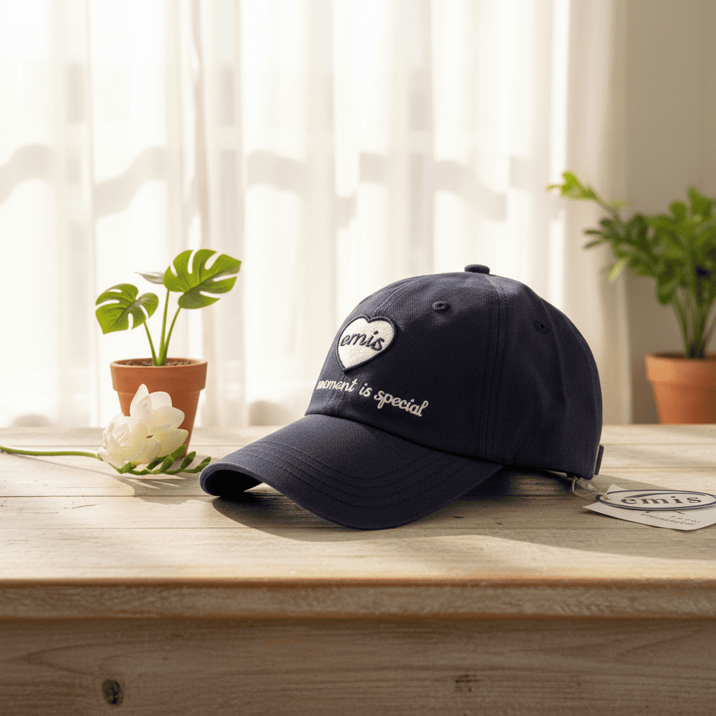 Emis Navy Blue Heart Embroidered Cotton Twill Baseball Cap, breathable and comfy, curved brim casual unisex design, stylish 3D letter logo for everyday trendy wear.