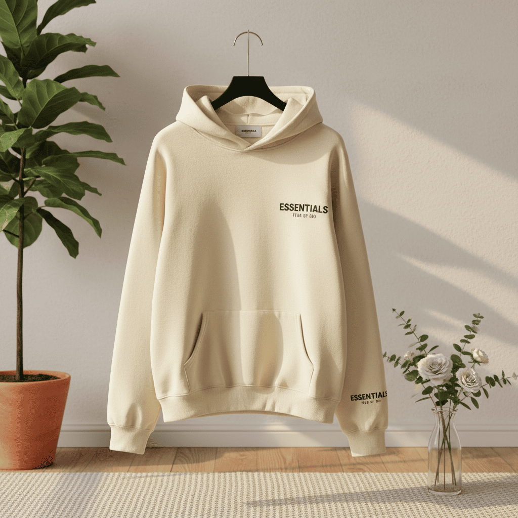 Essentials Cream Beige Hoodie—crafted from thick soft cotton with minimalist logo on chest and sleeve, loose fit for modern street style, unisex design, cozy and versatile for daily wear.