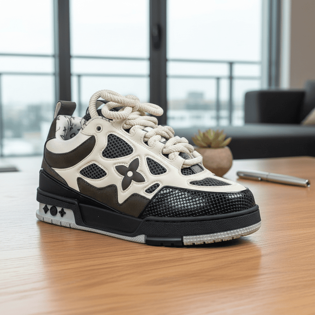 Louis Vuitton white-black Monogram floral cutout men’s sneakers blend premium leather and mesh with a thick shock-absorbing sole, exuding luxury street style for casual or fashion-forward looks.