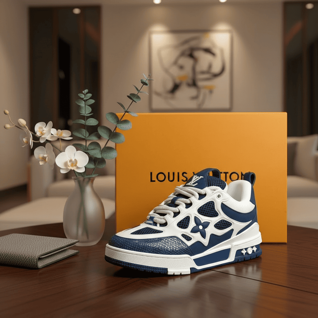Louis Vuitton blue and white men’s sneakers blend Monogram floral motifs with modern street style, crafted from calf leather and fabric, featuring cushioned, anti-slip soles for luxury comfort.