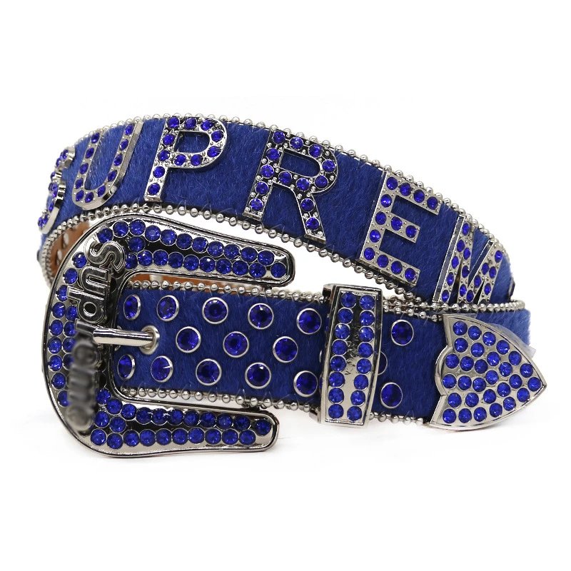 Supreme Blue Crystal Leather Belt with vintage silver buckle, 3D logo, and gemstone details. Unisex design combining street luxury style, fashion decoration, and durable function.