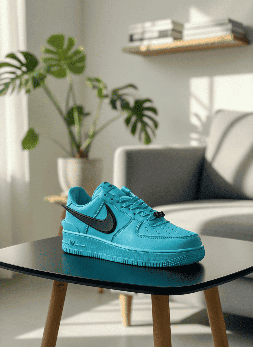Nike x AMBUSH Air Force 1 Low Bright Blue Sneakers blend premium leather and rubber with a bold black Swoosh, thick sole design, offering breathable comfort and edgy street style for men and women.