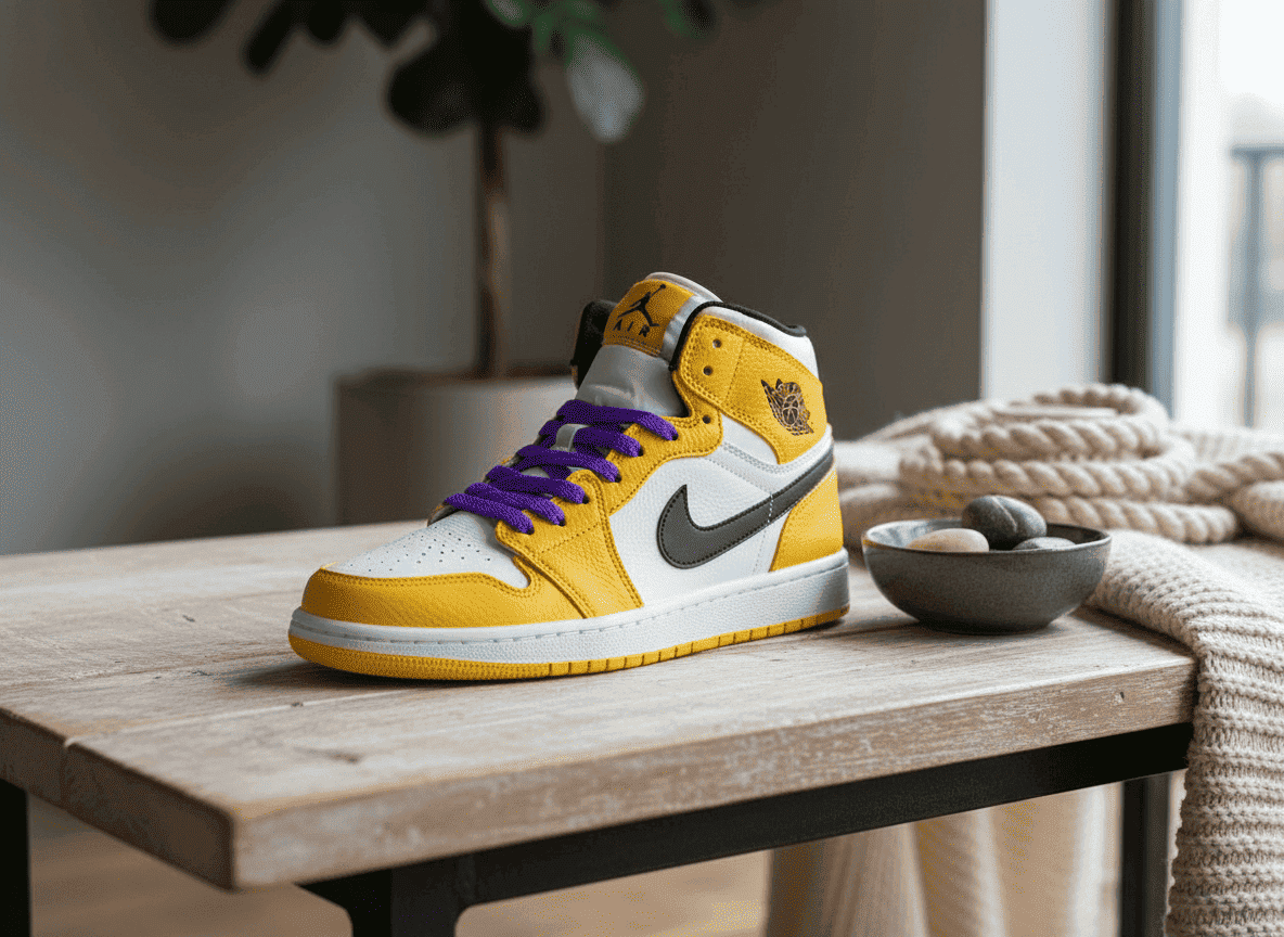 Nike Air Jordan 1 High Yellow White sneakers feature premium leather, black Swoosh, purple laces, iconic Wings logo, offering vintage basketball style and comfortable high-top support for men and women.