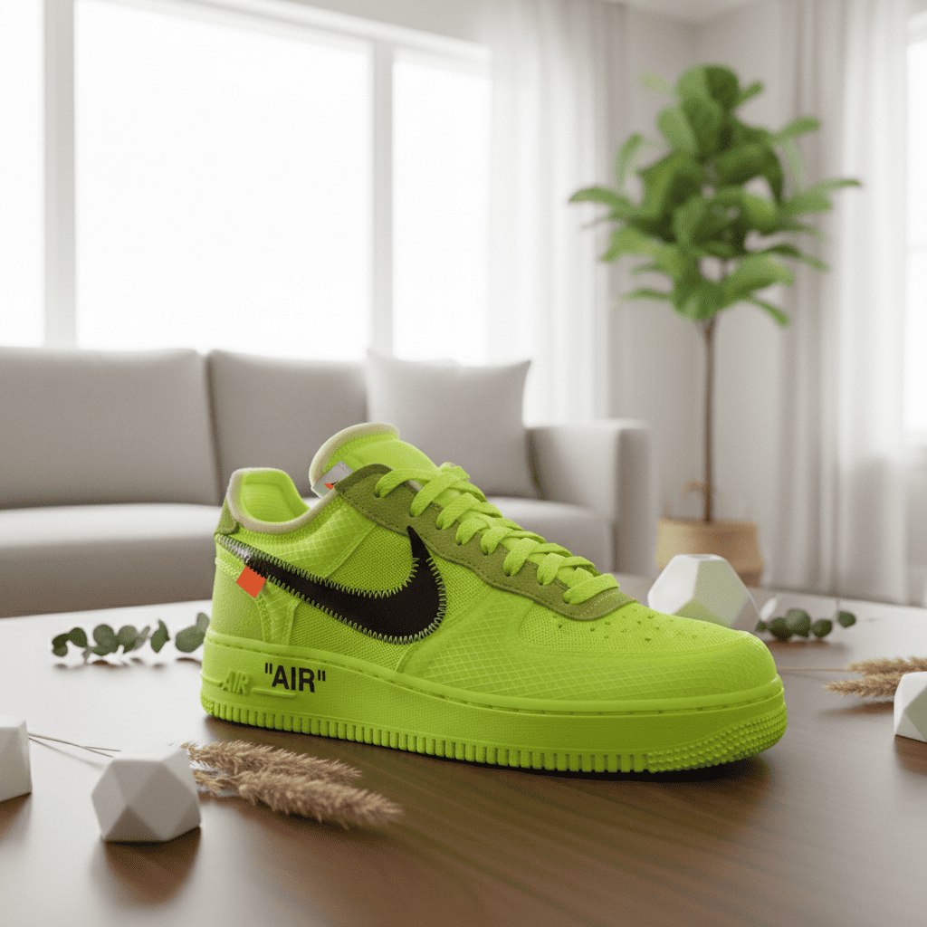 Nike Air Force 1 Low Fluorescent Yellow Sneakers, mesh and suede mix for breathable comfort, black Swoosh with orange accents, futuristic street style unisex design for modern urban fashion.