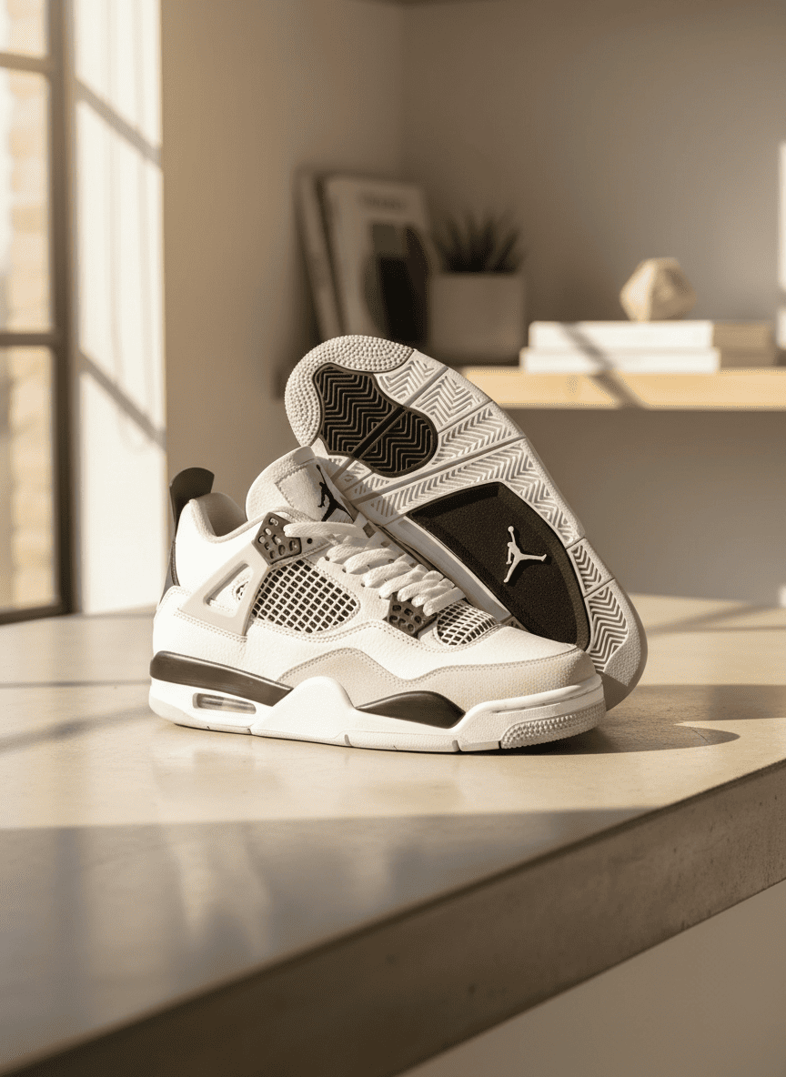 Nike Air Jordan 4 White Black Grey Sneakers with mesh and leather panels, Air cushioning for comfort, retro street style for men and women, blending sport performance with fashion appeal.