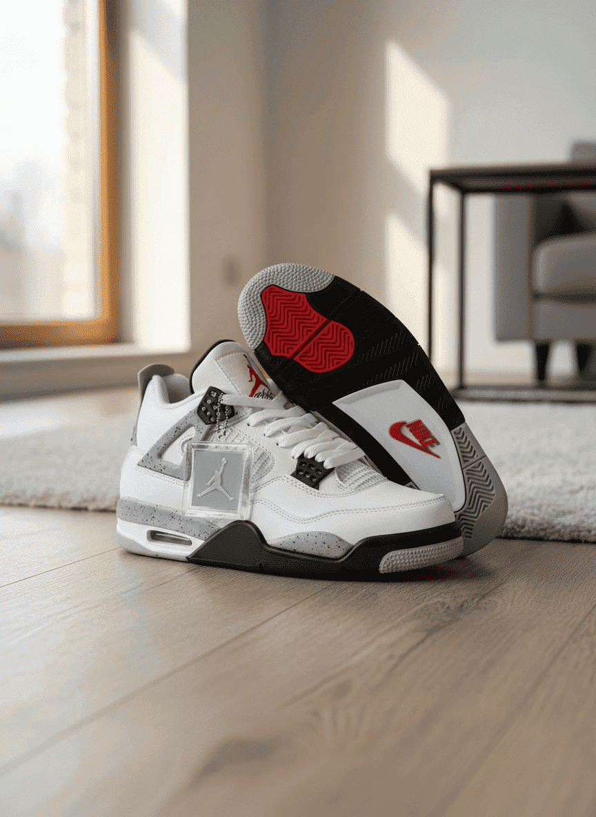 Nike Air Jordan 4 White Cement Retro—classic white and gray with red logo accents, premium leather and mesh upper, Air cushioning midsole, vintage basketball style, unisex streetwear comfort.