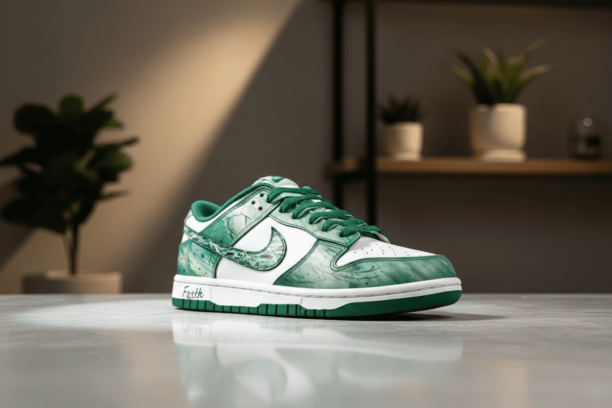Nike green and white low-top sneakers combine premium leather and fabric with natural pattern design, bold Swoosh, “Faith” script, retro style, lightweight comfort, unisex, perfect for casual streetwear.