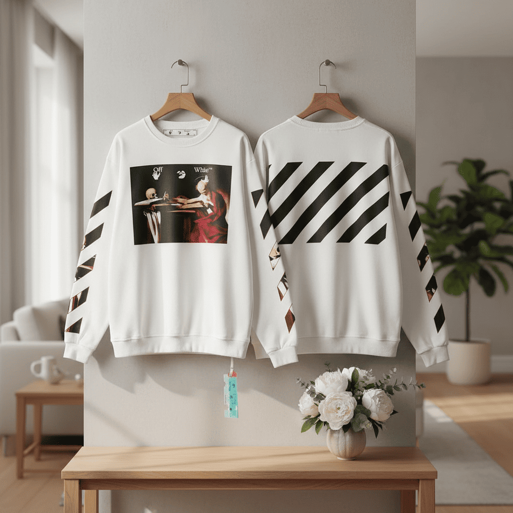 Off-White White Baroque Print Sweatshirt, soft cotton fabric with classic crew neck, signature arrow stripes on sleeves, avant-garde art graphic, unisex modern streetwear aesthetic.