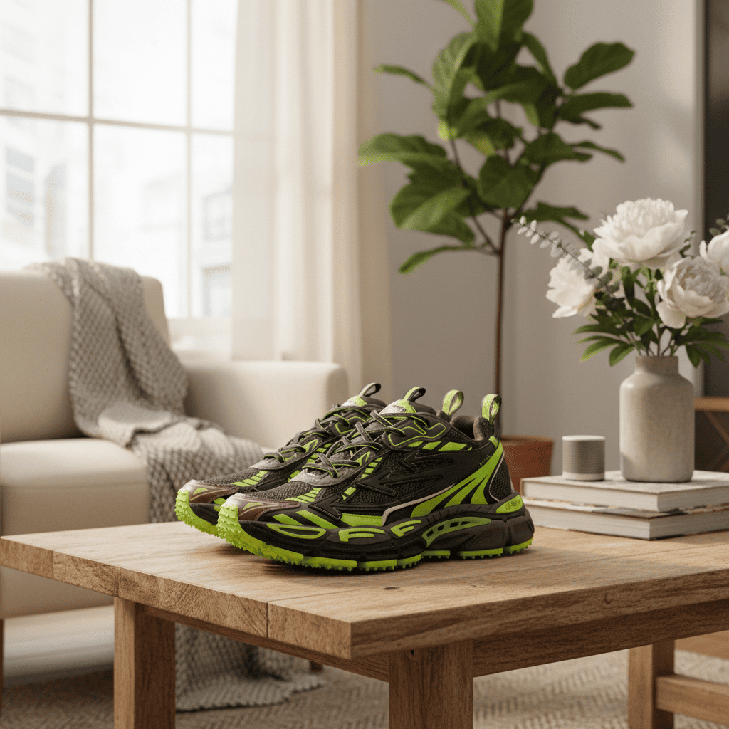 Off-White Trail Sneakers in black and green feature mesh panels, chunky tech sole, and futuristic design by Virgil Abloh. Unisex, breathable, and perfect for both street style and outdoor performance.