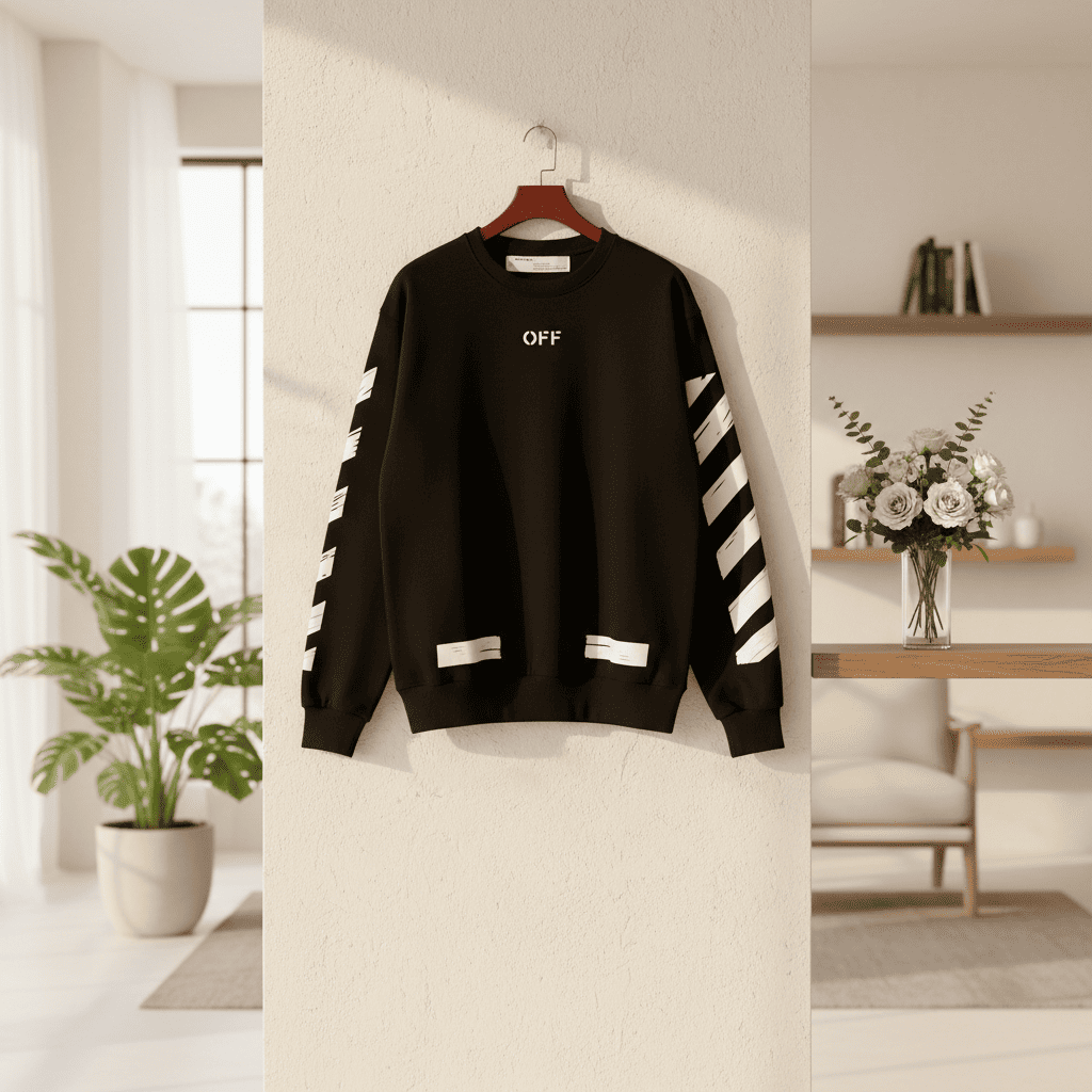 Off-White Black Striped Print Sweatshirt made from soft cotton, features signature diagonal sleeve design, classic crew neck, unisex style for casual urban fashion and everyday comfort.