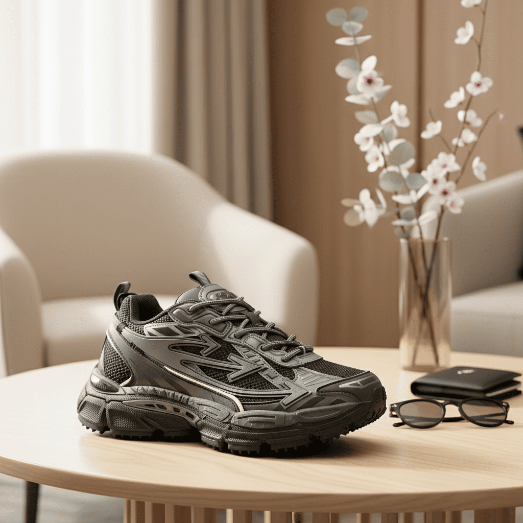 Off-White Grey Black Chunky Sneakers blend mesh and TPU for lightweight breathability and strong support, featuring futuristic lines for a bold unisex streetwear style and modern urban attitude.