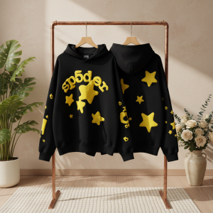 PantsSp5derSp5der black casual sweatpants made from soft cotton, featuring a pink 3D logo and star prints on the back. Streetwear-inspired design, unisex loose fit for comfort and modern style.