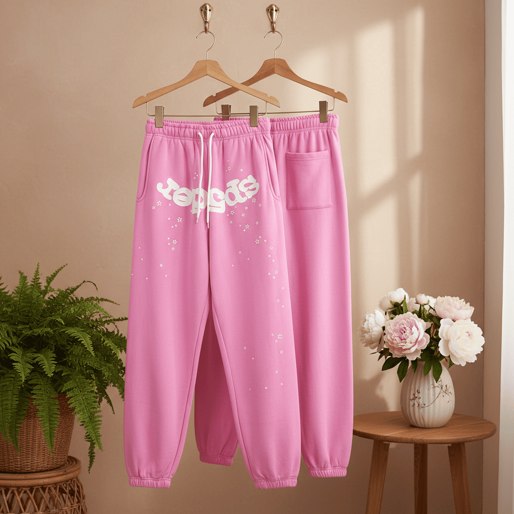 Sp5der Pink Casual Sweatpants made from soft cotton with star prints and logo, elastic drawstring waist, unisex design for comfort and trendy streetwear style. Perfect youthful fashion vibes.