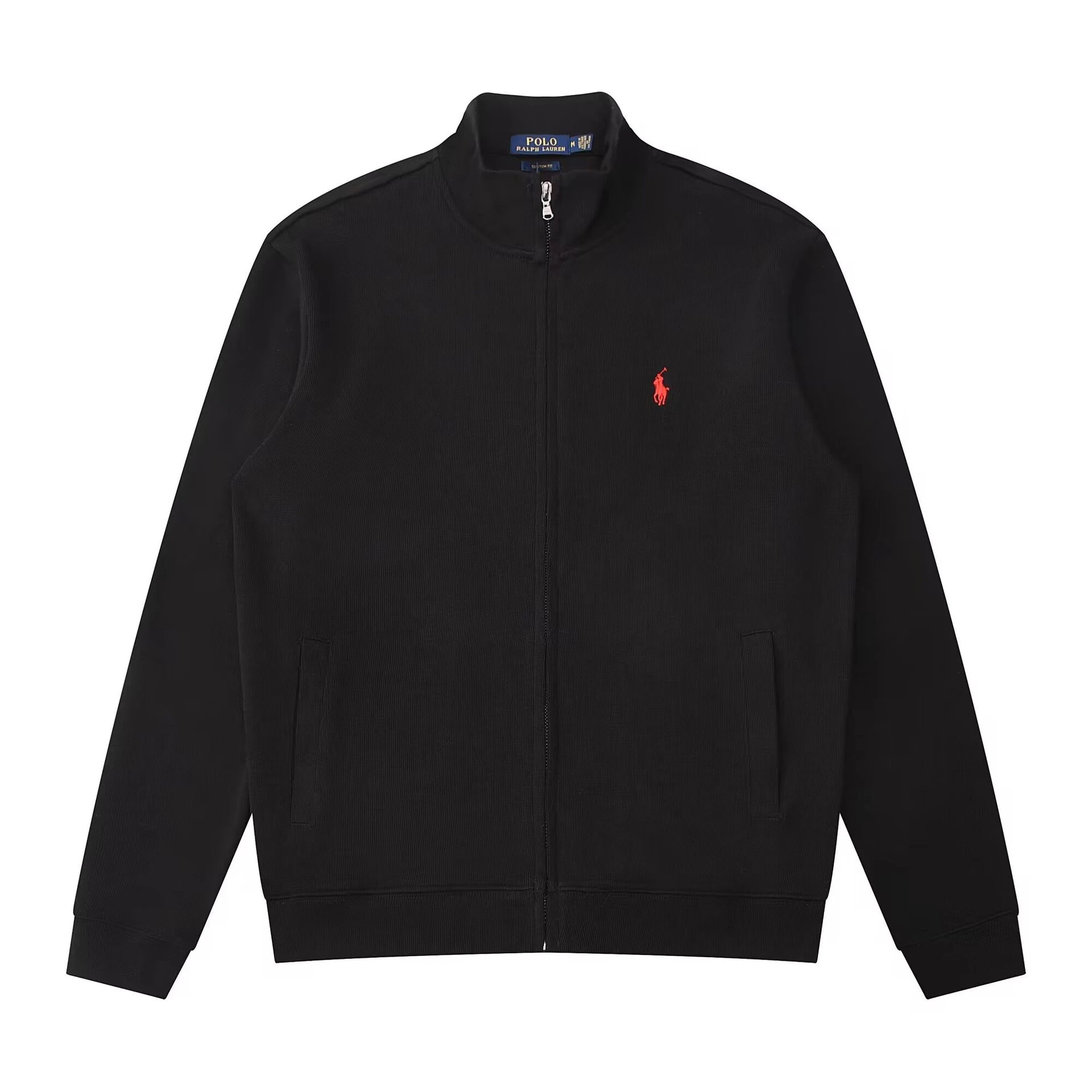 Ralph Lauren black full-zip stand collar jacket with soft cotton fabric, iconic red Polo rider logo, classic minimalist design, versatile unisex style for everyday wear.