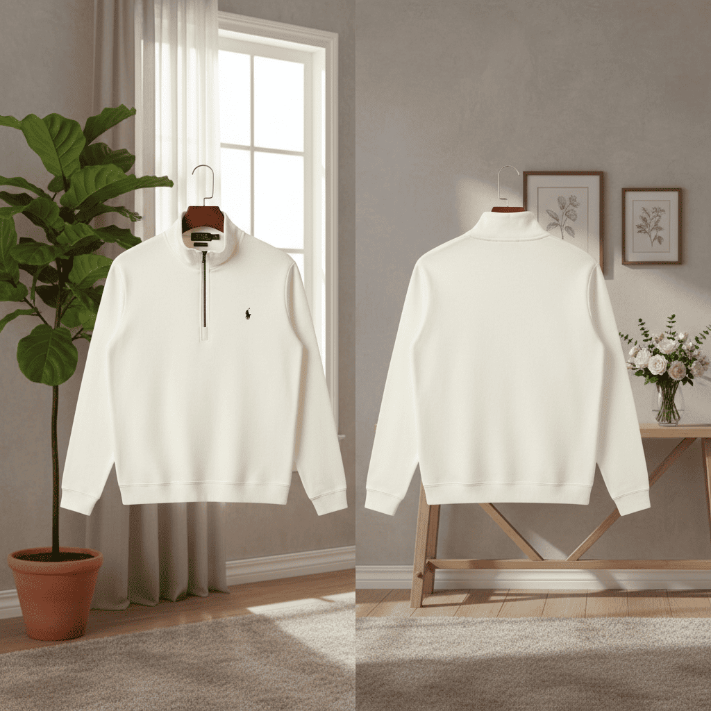 Ralph Lauren classic off-white half-zip cotton knit sweatshirt, soft and breathable, iconic pony logo embroidery, unisex design for elegant American casual or preppy style.