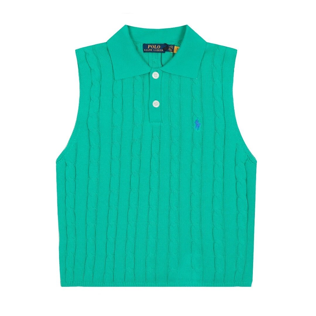 Ralph Lauren Polo green sleeveless knit top, soft cotton with cable texture, classic collar and button placket, signature pony logo, fresh unisex casual style.