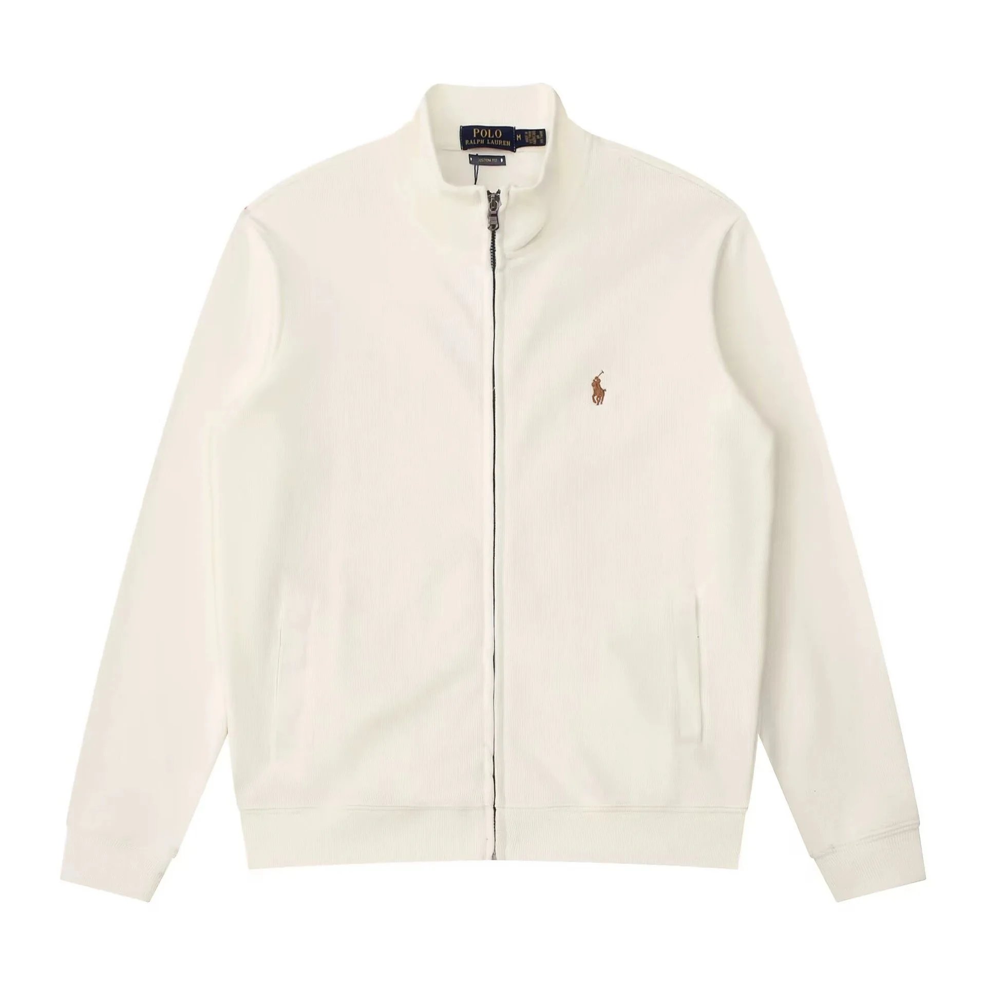 Ralph Lauren white full-zip cotton jacket with signature embroidered polo logo, classic stand collar, soft premium fabric, timeless minimalist design for men and women.