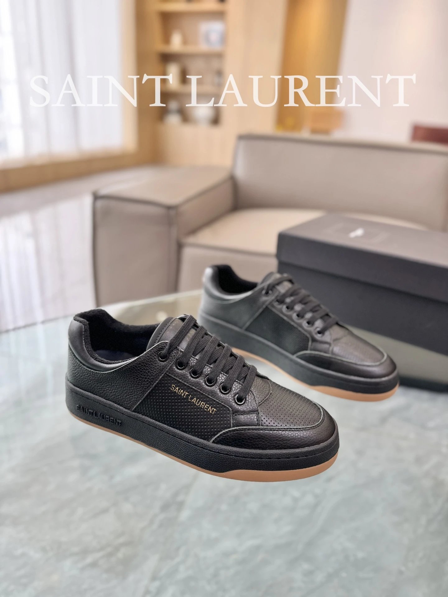 Saint Laurent black leather sneakers crafted from premium perforated leather with gold logo detail. Lace-up design with durable rubber sole. Unisex, breathable, elegant, perfect for daily urban style.