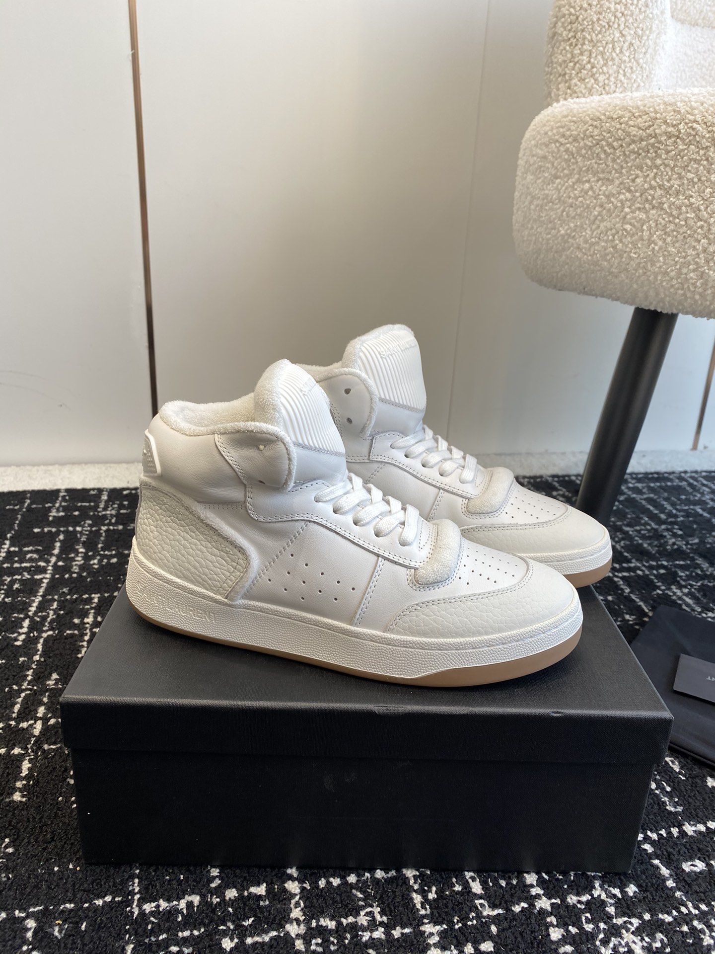 Saint Laurent white high-top sneakers crafted from premium leather, featuring sleek lines, embossed logo detail, retro-meets-modern design, comfy lining and durable rubber sole for everyday style.
