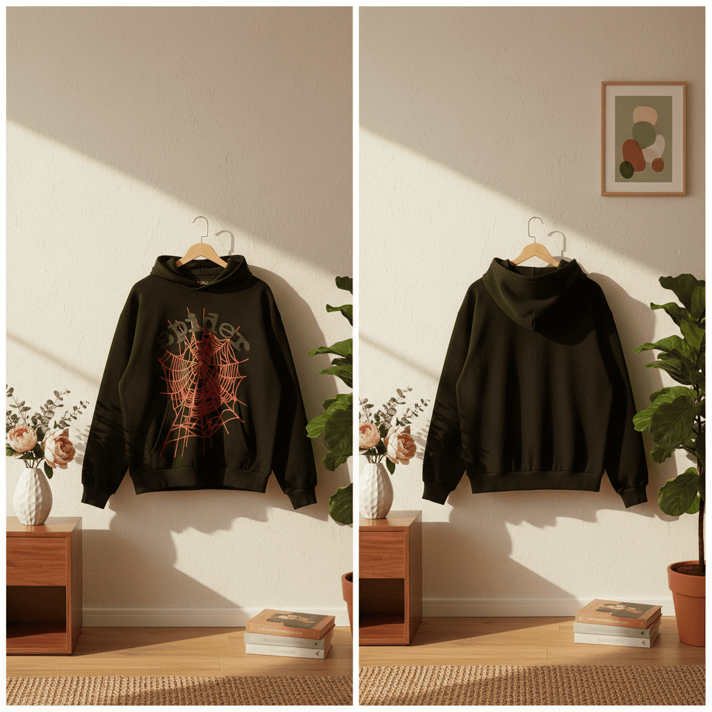 Sp5der Black Street Hoodie made from soft cotton, featuring red spiderweb print and 3D logo on chest, unisex loose fit blending millennial street style with bold urban fashion.