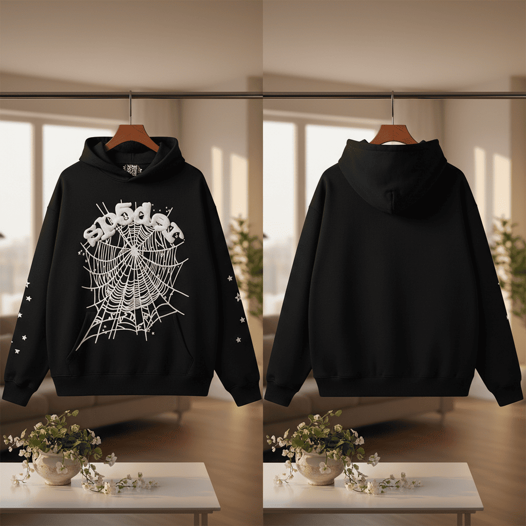 Sp5der Black Hoodie Web Graphic Streetwear Pullover