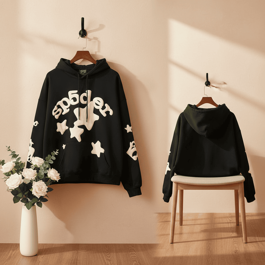 Sp5der Black Star Print Hoodie, made of premium soft cotton, features 3D cream star logo, relaxed fit, drawstring hood and kangaroo pocket for a gender-neutral American streetwear look.