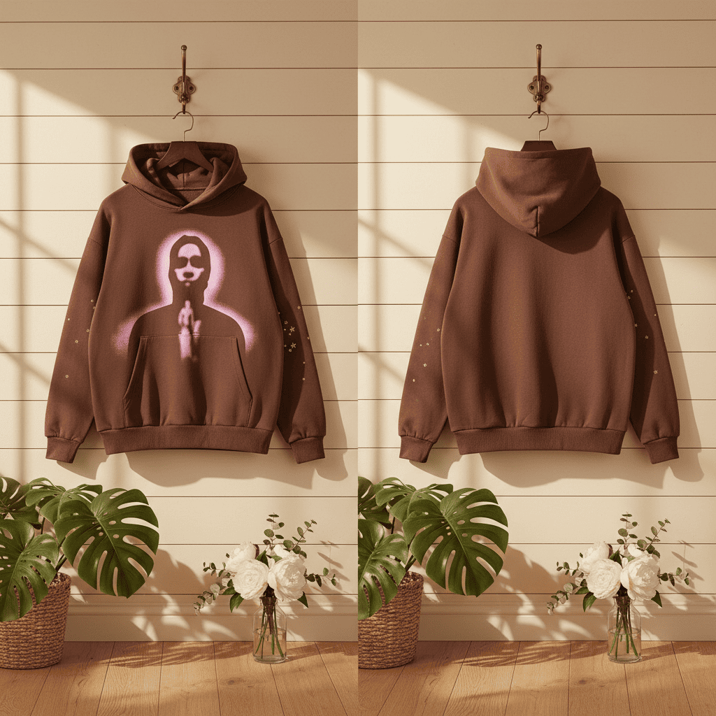 Sp5der Coffee Brown Street Hoodie, made of soft thick cotton, features pink-purple silhouette with golden star prints, blending retro and futuristic art style for unisex autumn winter casual wear.
