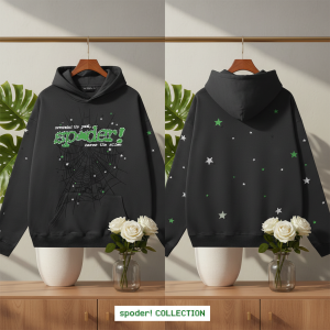 Sp5der Green Hoodie Set: Soft cotton fabric with casual fit, vibrant spider-web print on chest, blends streetwear style and brand identity, unisex design for daily wear showing youthful energy and attitude.