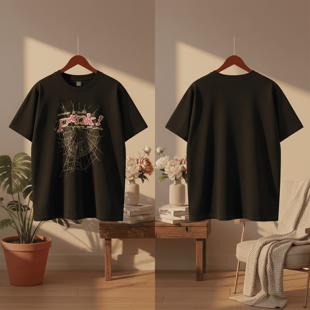 Sp5der Pink Graphic T-Shirt, made of soft breathable cotton, features spiderweb and graffiti logo print, Y2K street hip-hop style, loose unisex fit for trendy everyday wear.