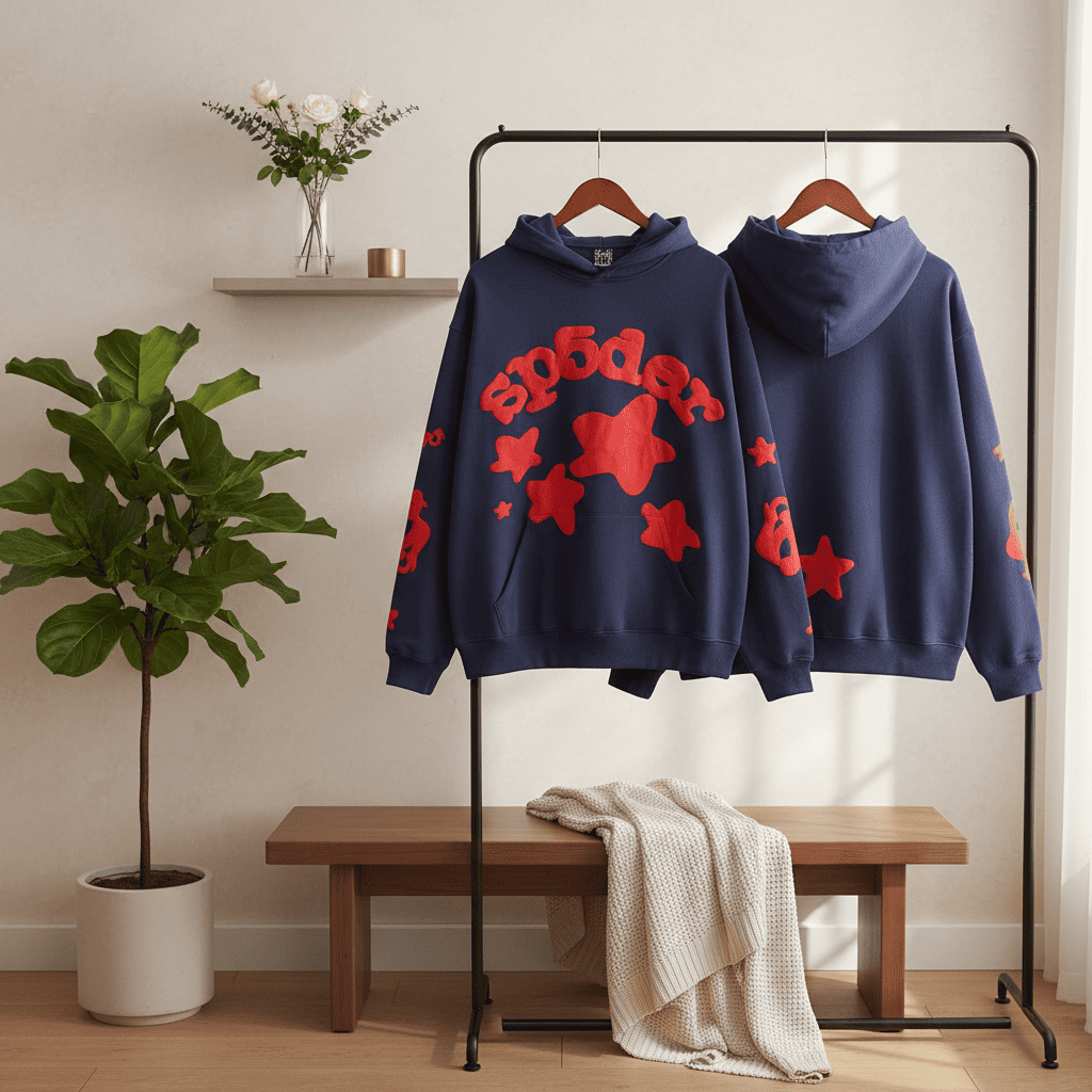 Sp5der Navy Red Star Graphic Streetwear Hoodie