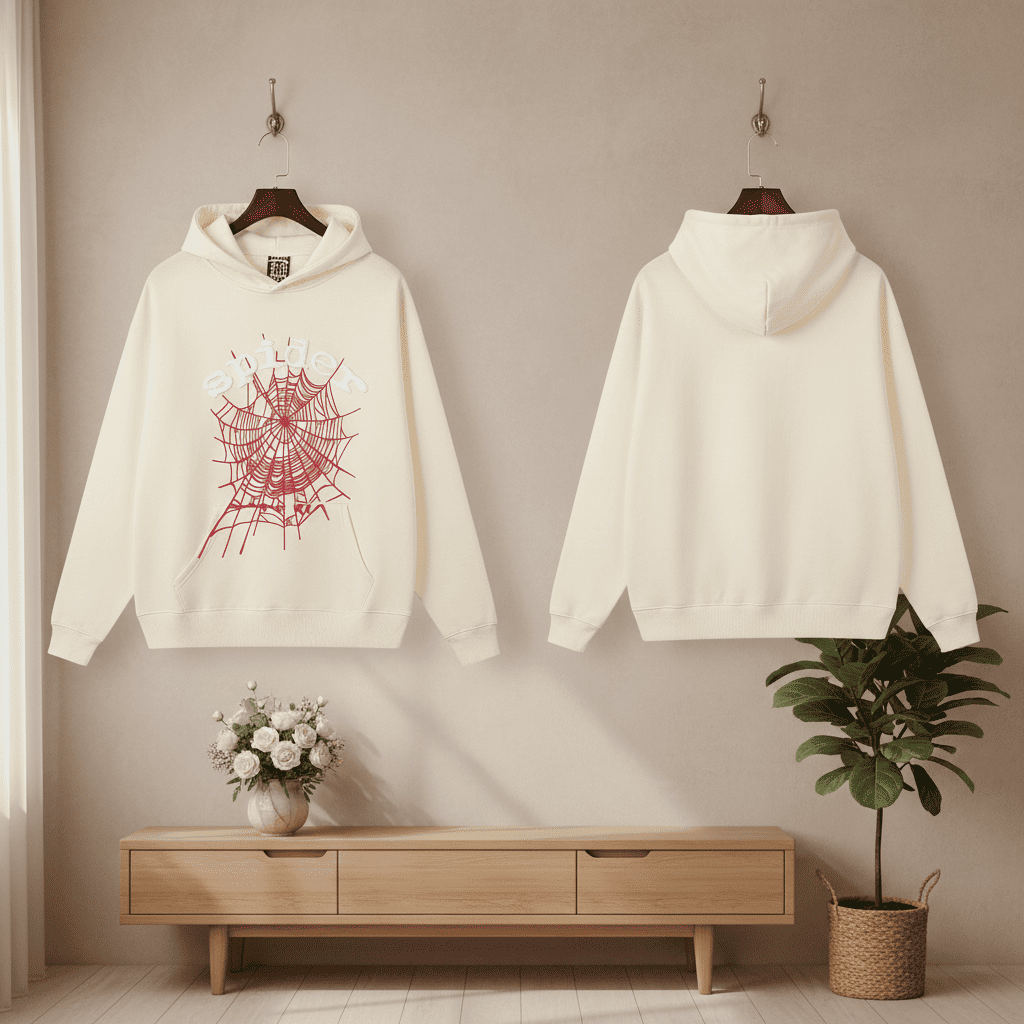 Sp5der Beige Hoodie crafted from soft cotton, featuring bold red spider web print and 3D logo design. Unisex streetwear style that highlights individuality and fashion attitude.