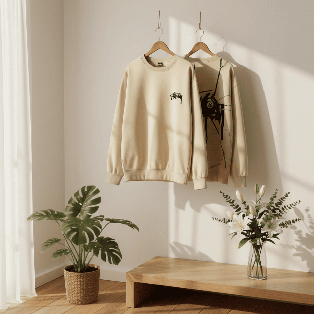 Stussy Beige Street Style Cotton Crewneck Sweatshirt with classic logo front and creative contrast cracked 8-ball back design; loose unisex fit for retro urban fashion and everyday comfort.