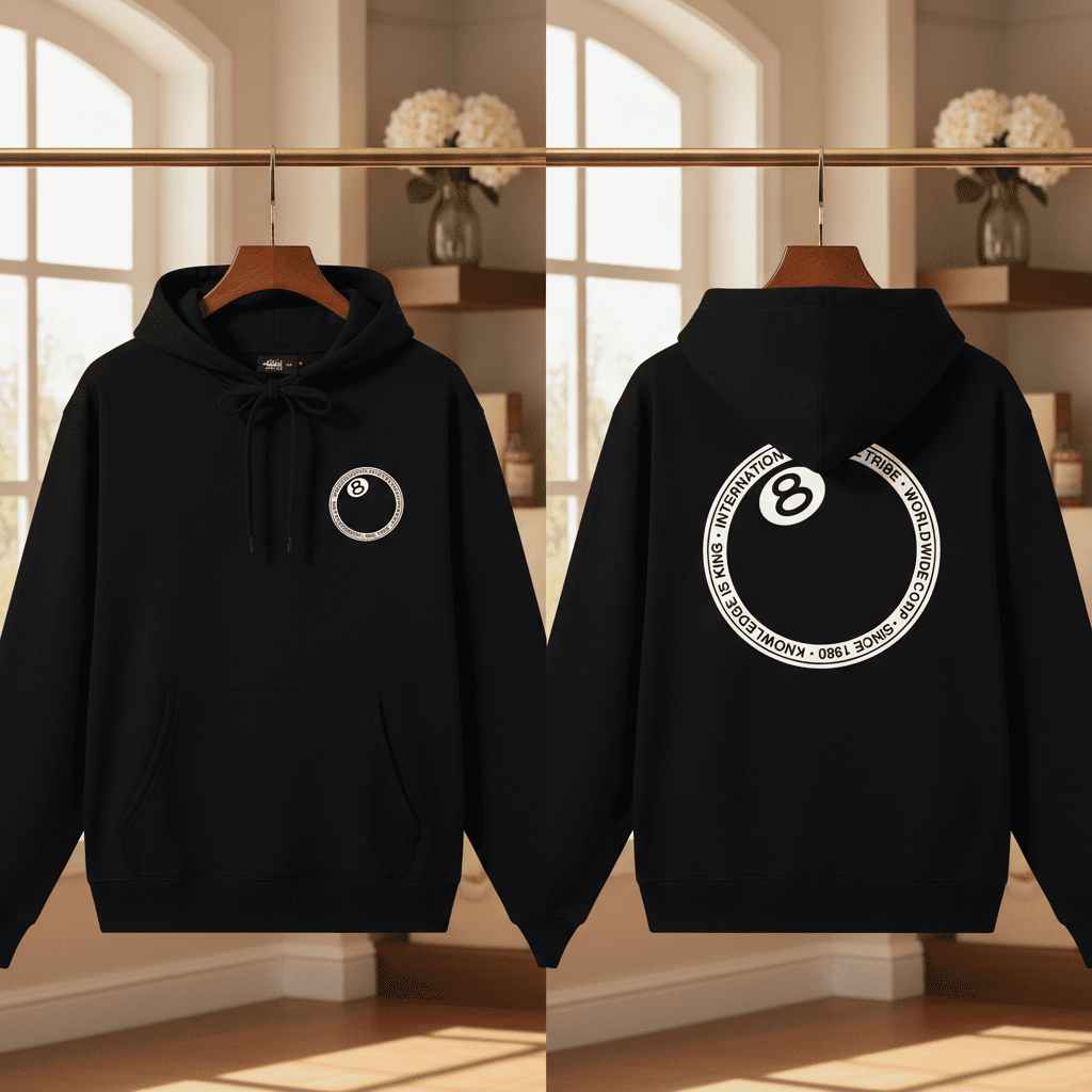 Stussy Black 8 Ball Hoodie made from premium cotton, soft and comfy. Features bold 8 Ball graphic and circular logo on back, drawstring hood, ribbed cuffs. Unisex streetwear style with retro-modern vibe.