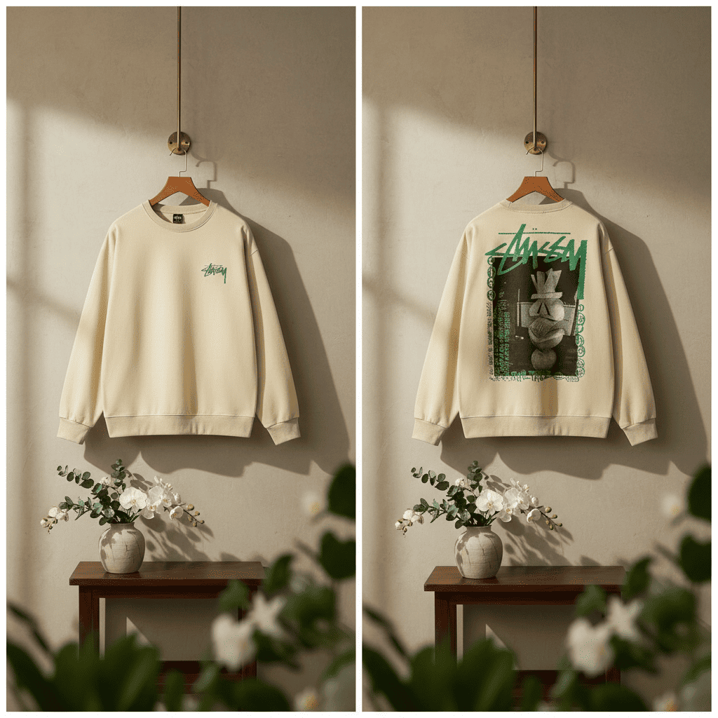 Stussy Beige Cotton Sweatshirt with green logo print and artistic back graphic. Unisex loose fit, soft breathable fabric, ideal for casual streetwear with a blend of retro and modern style.