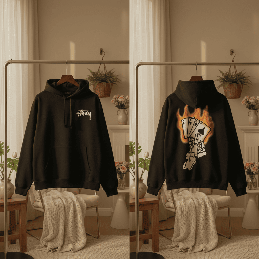 Stussy Black Flame Skull Hoodie, made of high-density cotton for soft breathability. Featuring bold logo front and burning poker graphic back, loose unisex fit shows 90s skate culture vibe.