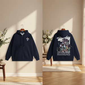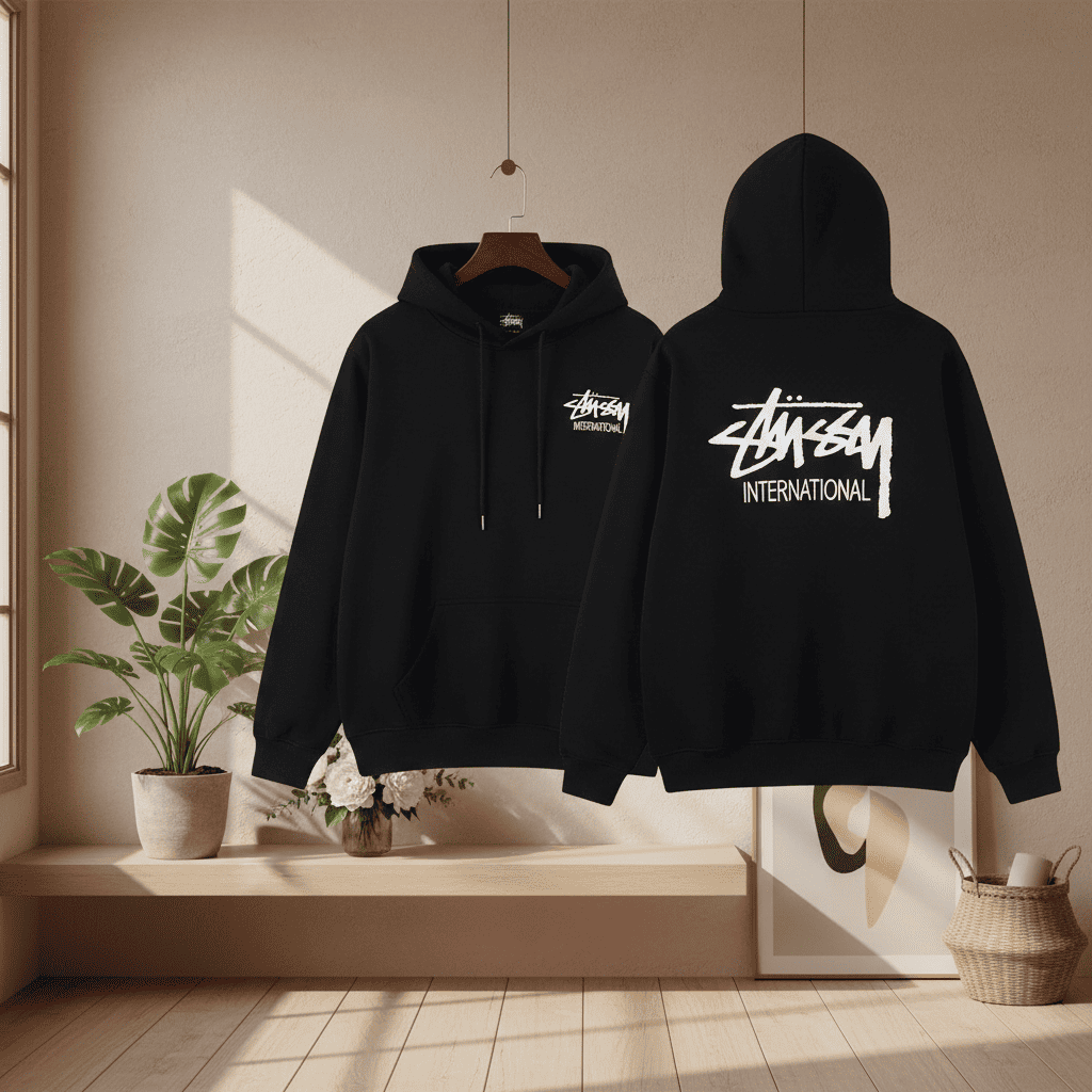 Stussy Black Cotton Hoodie with white logo print. Soft, warm, and stylish streetwear inspired by skate culture. Classic drawstring hood and kangaroo pocket. Unisex casual fashion for urban lifestyle.