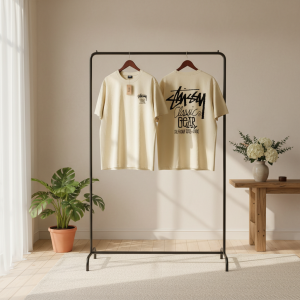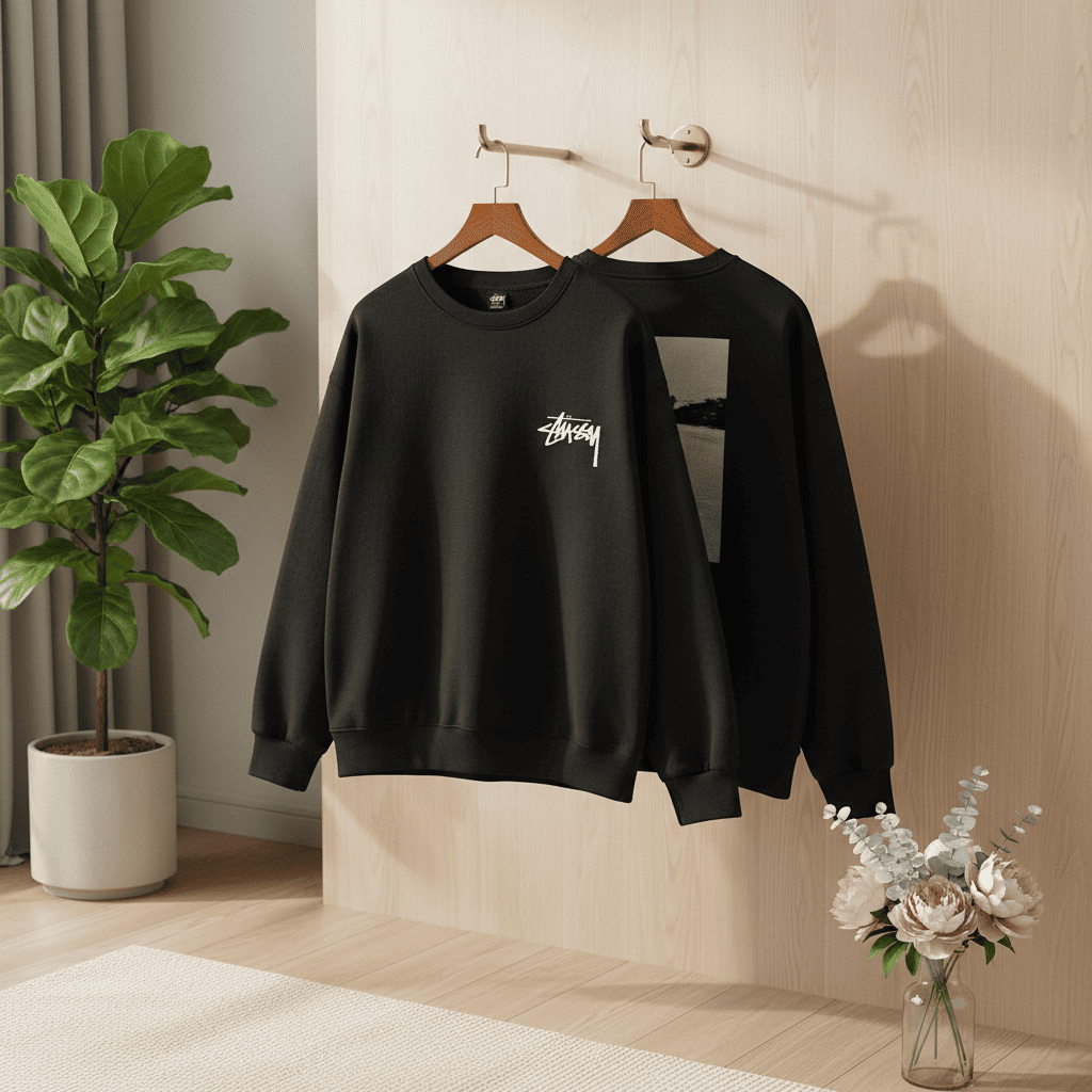Stussy Black Cotton Sweatshirt featuring signature front logo print and artistic street photo graphic on back; unisex loose fit for a vintage American streetwear style with comfort and fashion.