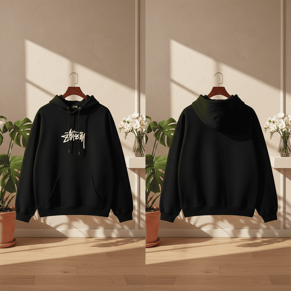 Stussy Classic Black Logo Hoodie made from soft cotton, features signature white graffiti logo, relaxed fit and drawstring hood, unisex streetwear inspired by 90s skate culture, perfect for everyday casual wear.