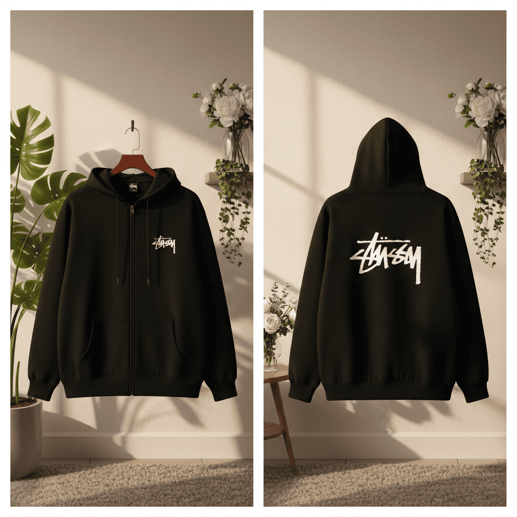 Stussy Black Zip-Up Hoodie made from premium high-density cotton, featuring iconic white hand-written logo, soft unisex fit, streetwear style combining warmth, comfort, and classic American urban fashion.