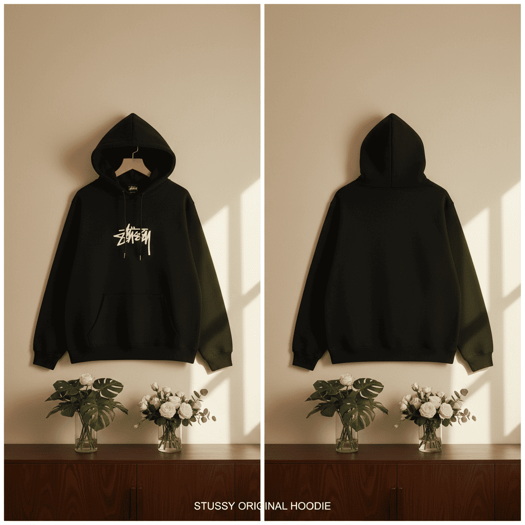 Stussy Black Hoodie made of premium soft cotton, featuring iconic white graffiti logo, relaxed unisex fit, drawstring hood, kangaroo pocket, 90s skate inspired streetwear for everyday comfort.