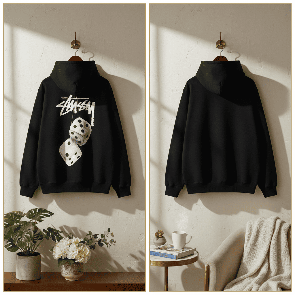 Stussy Black Dice Graphic Hoodie, made of soft cotton with front and back logo prints, features a street vintage style for both men and women, perfect for casual fashion lovers.